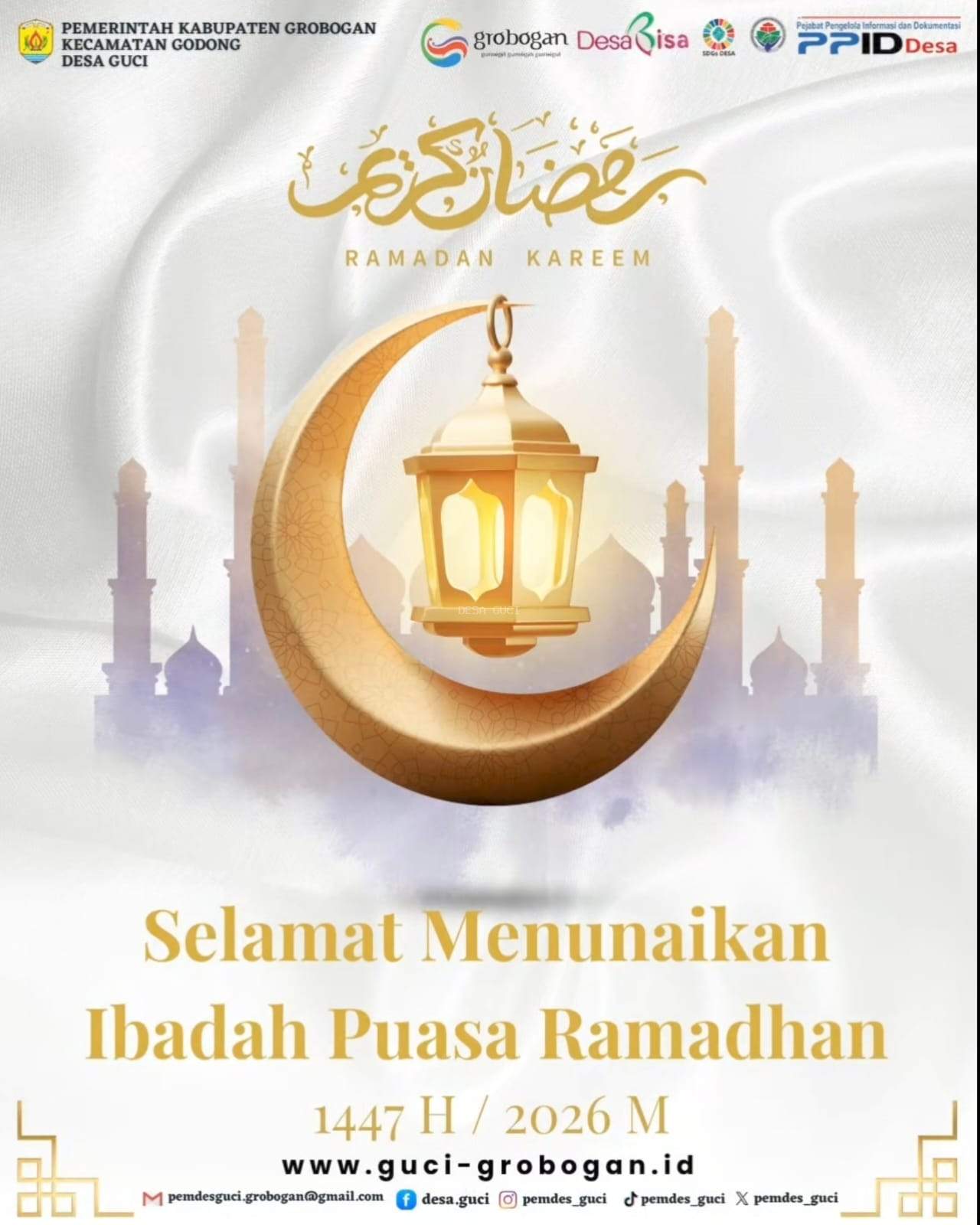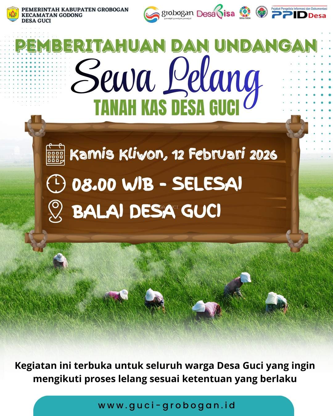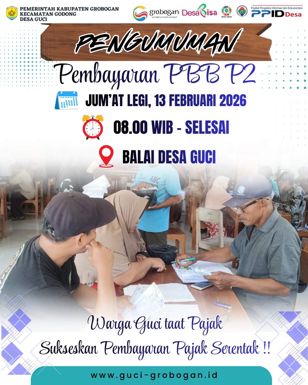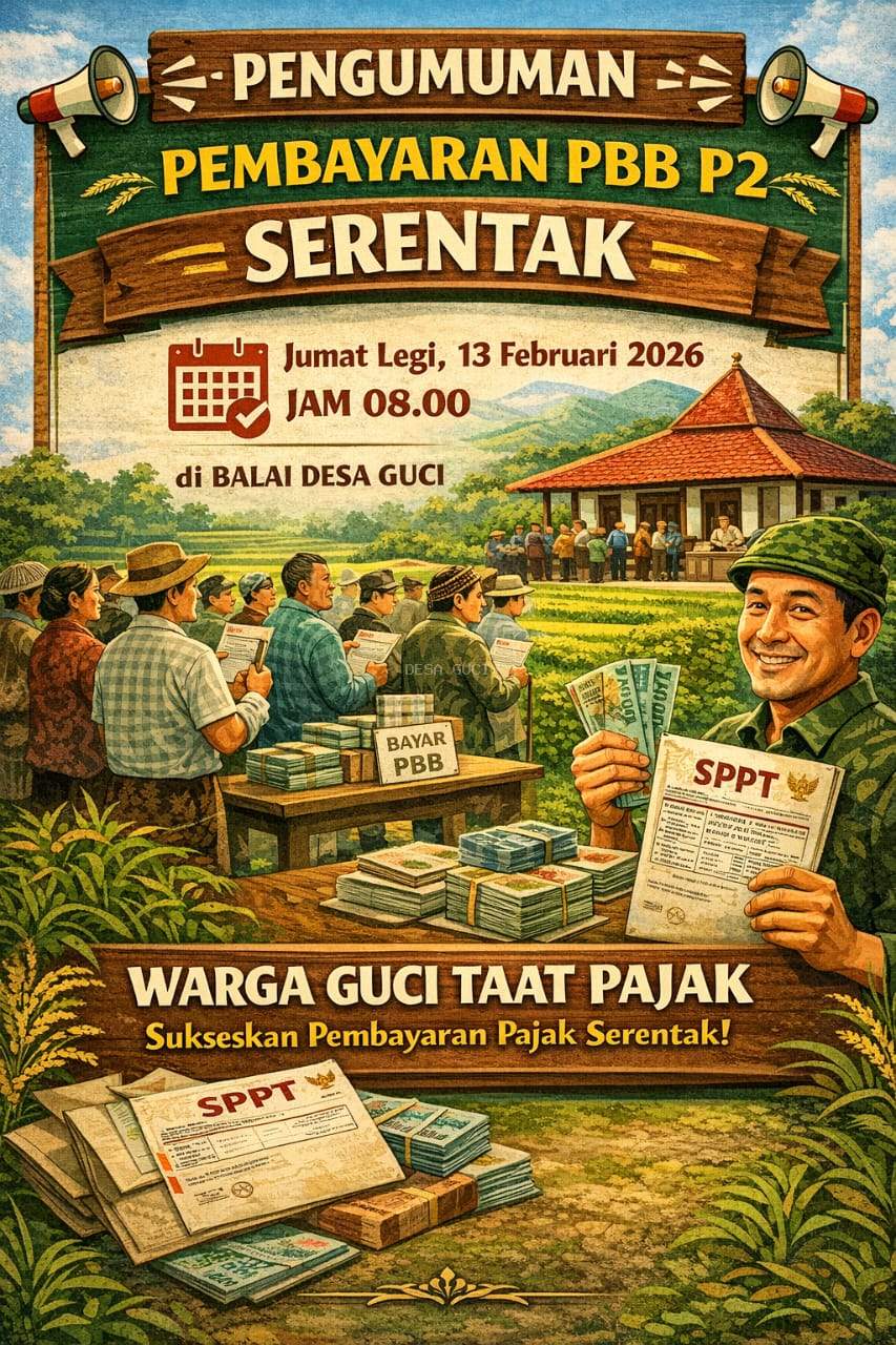 05 Februari 2026 Sewa Lelang Tanah Kas Desa Guci 2026 dilaksanakan Kamis Kliwon, 12 Februari 2026       05 Februari 2026 Pembayaran PBB-P2 Serentak 2026 Desa Guci dilaksanakan Jum'at Legi 13 Februari 2026       10 Januari 2026 Surat Pernyataan Tidak Ada Kasus Korupsi 3 Tahun Terakhir       31 Agustus 2025 JALAN SEHAT BARENG WARGA DESA GUCI 2025